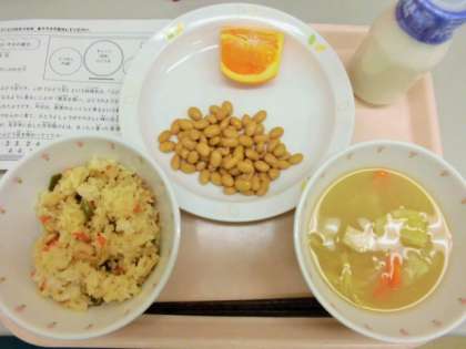 今日は、とりめし、牛乳、ぶどう豆、キャベツと筍のみそ汁、清美オレンジです。