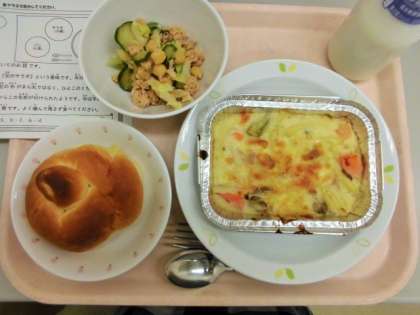 今日は、パインパン、牛乳、マカロニグラタン、ビーンズサラダです。