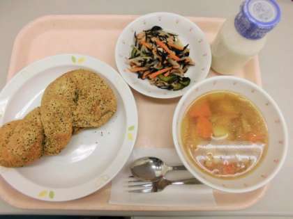 今日は、ごまきな粉揚げパン、牛乳、ひじきとツナのサラダ、白いんげん豆の田舎風スープです。
