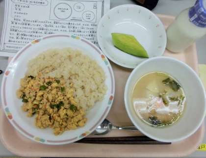 今日は、四色そぼろ丼、牛乳、かぶのみそ汁、メロンです。