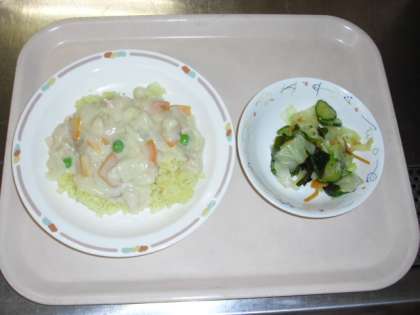2学期最初の給食の献立は、「ドリア風」「わかめサラダ」でした。子どもたちにとって食べやすい給食にしようと栄養士が考えました。牛乳もぎりぎりまで、冷蔵庫に入れて保管し、できるだけ冷たく飲めるようにしました。残暑厳しい日には、とても言い献立で、子どもたちもしっかり食べていました。