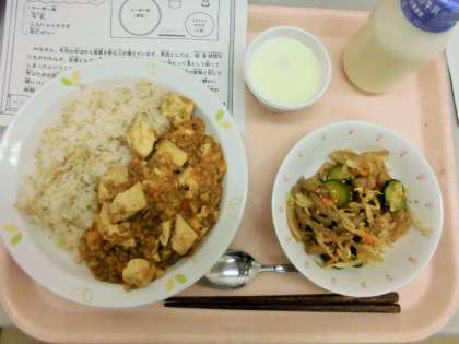 今日は、マーボー丼、牛乳、こんにゃくサラダ、あんにんゼリーです。