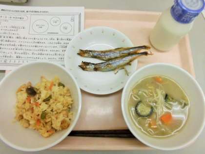 今日は、きのこごはん、牛乳、焼きししゃも、なすとそうめんのみそ汁です。
