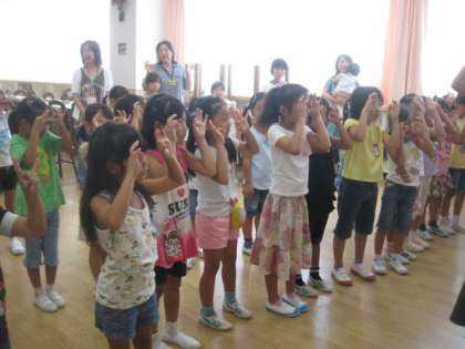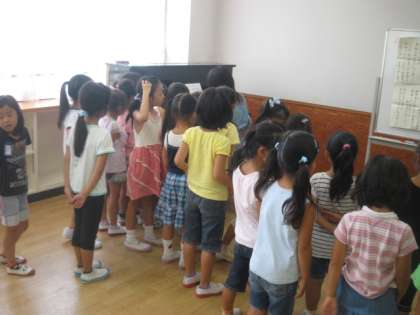 音楽ボランティア「おたまじゃくし」による「歌声広場」がありました。休み時間、ランりルームに、歌を歌いたい子どもたちが集まります。校歌や秋の歌を歌いました。暑い中ですが、元気な歌声が聞こえてきました。