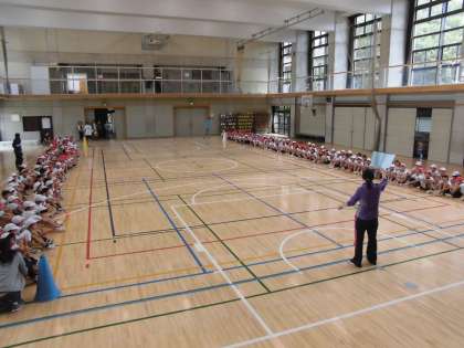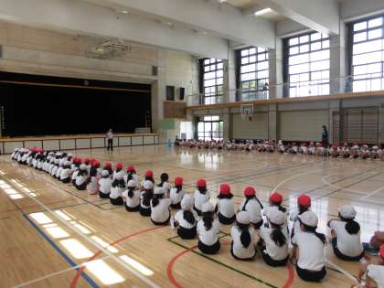12日(月)1,2校時に3年生プール開きが行われました。天気は曇り。気温も上がらなかったため、体育館をプールに見立ててのプール開きとなりました。代表児童のめあての発表の後、プールに入る前、プールの中、プールから出た時の約束事、バディチェック、リズム水泳の行い方などを確認しました。児童の健康面、安全面を第一に考え、楽しく「浮く・泳ぐ運動」に取り組み、一人ひとりがめあてを達成できるよう指導していきたいと思います。