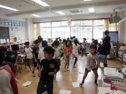 6月のわくわくモーニングは「ステップダンス」です。縦、横、ななめ、後ろ向き、一回転、などなど多様に定められたステップを、AAA「Wake up!」の曲に合わせて踏んでいきます。7月6日(木)8時30分〜45分の時間に1,3,6年生が校庭に集まり、クラスごとに「ステップダンス発表会」が開かれます。クラスごとに隊形を工夫したり、上半身の動きや掛け声などを工夫したりして、発表会に向けて一致団結して取り組んでいきます。今朝のわくわくモーニングは、校庭がぬかるんでいたため、教室で練習をしました。