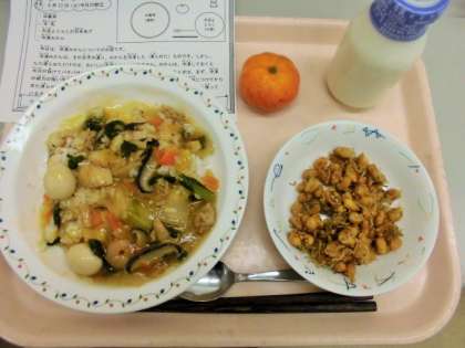 中華丼、牛乳、大豆とじゃこの甘辛揚げ、冷凍みかんです。