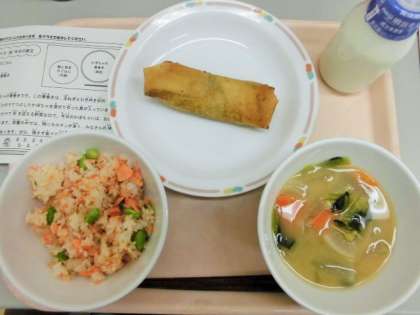 今日は、鮭とえ枝豆のごはん、牛乳、かぼちゃの春巻き、みそ汁です。