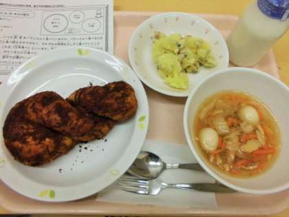 今日は、ココアあげパン、牛乳、ジャーマンポテト、春雨スープです。