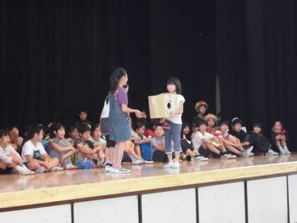 6月22日(木)の児童集会は、なかよしフェスタ紹介集会でした。27日(火)に行われるなかよしフェスタ本番に向け、全校児童に各クラスのお店をPRしました。初めてのお店の出店となる3年生も、工夫を凝らしたPRでそれぞれのお店の魅力を伝えていました。的当てやお化け屋敷、ワニたたき、ブラックボックスなどなど、バラエティに富んだお店が3年生から出店されます。来てくれるお客様を満足させることを目指す中で、クラスの団結や相手を思いやる気持ちを育んでいく姿を期待しています。