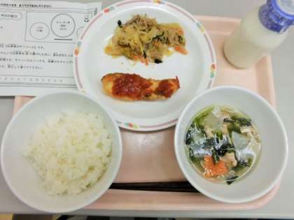 今日は、ごはん、牛乳、白身魚のチリソース、チャーホーサイ、株のスープです。