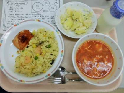 今日は、ピラフ、牛乳、鶏肉のマーマレード焼き、粉ふきいも、トマトと卵のスープです。