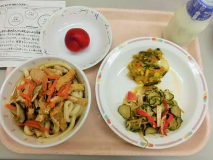 今日は、冷やしうどん、牛乳、かき揚げ、中華風ごまだれかけです。