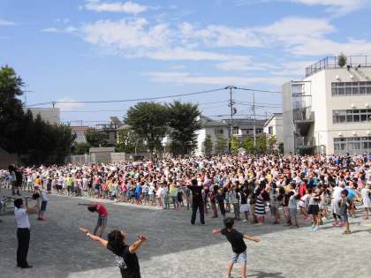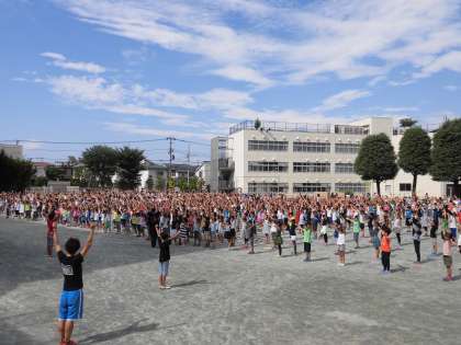 夏休みに入ると、校庭でラジオ体操が始まります。