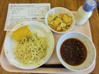 今日は、冷やし中華、牛乳、ゆでとうもろこし、野菜チップスです。
