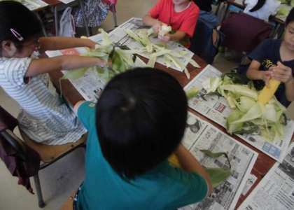 今日のとうもろこしは、塚戸小学校全員分でなんと400本です。この400本全部の皮むきを1年生のみなさんがやってくれました。全校のみなさんに、よりおいしいとうもろこしを食べてもらおうと、皮はもちろん、ひげの一本一本まで丁寧に取り除いてくれています。今年のとうもろこしは、例年以上に太く、下の芯を折るのにもとても力がいり大変でしたが、最後まであきらめず、力を振り絞って折ってくれました。ぜひ、1年生のみなさんにありがとうの気持ちをもって、このとうもろこしをいただきましょう。