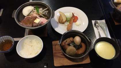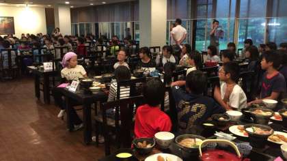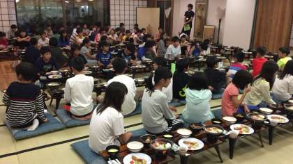 ホテルのおいしい食事に子どもたちも大満足。人数が多いので2ヶ所に分かれて食べました。