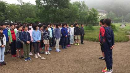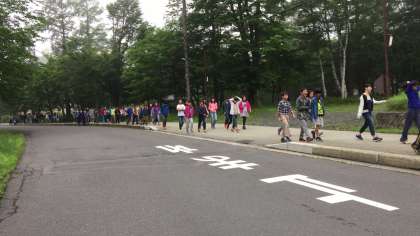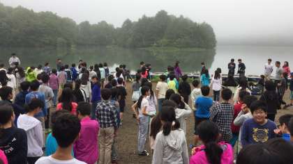 歩いて5分のところにある湯の湖。ここで朝会を行いました。霧の湖畔の雰囲気も魅力的です。