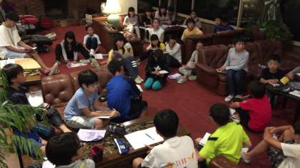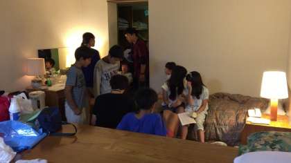 室内レクの興奮もおさまらないうちに、就寝の時間が近づいてきました。班長会議、美化係の打ち合わせ、健康観察、歯磨き、荷物整理…。就寝前の30分は大忙しです。