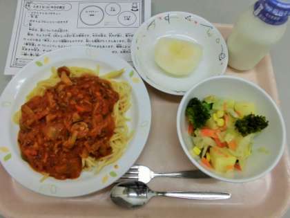 今日は、ツナトマトスパゲティー、牛乳、ポテトとブロッコリーのサラダ、梨です。