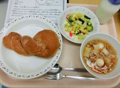 今日は、シナモン揚げパン、牛乳、カラフルサラダ、春雨スープです。