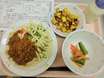 今日は、冷やし肉味噌うどん、牛乳、カリカリ豆さつま、野菜の中華味です。