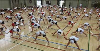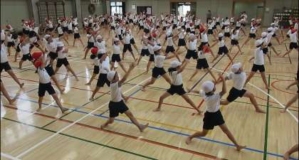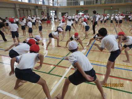 5年生、ソーラン節を練習しています。一緒にやってみました。何度もしゃがんでは起き、腕を右に左にと伸ばし、全身を使うとても激しい動きです。本番、懸命に取り組む5年生を楽しみにしていてください。