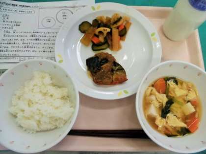 今日は、ごはん、牛乳、魚のごまだれかけ、シャキシャキ野菜、かきたま汁です。