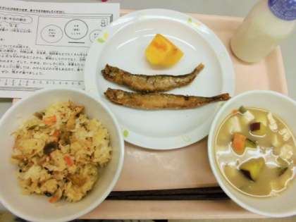 今日は、きのこごはん、牛乳、ししゃもの唐揚げ、さつま汁、柿です。