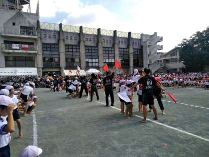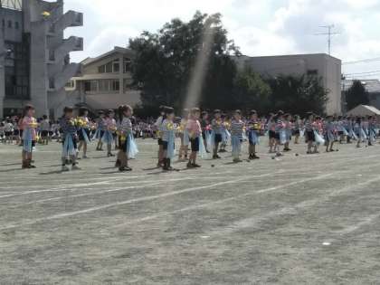 順調に演技・競技が進んでいます。写真は1年生の表現「しゅっぱつ!アロハかいぞくだん」、そして、5・6年生の騎馬戦です。