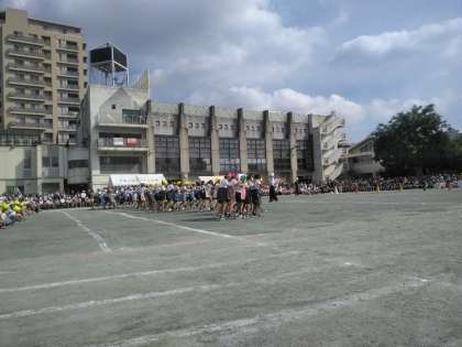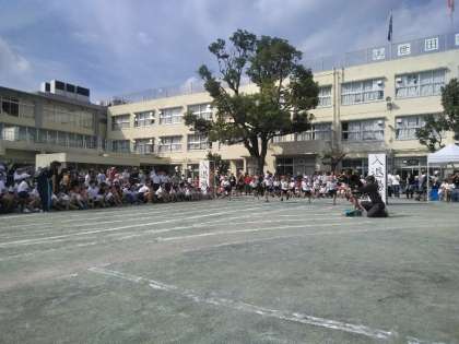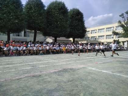 午後の部も順調に進んでいます。写真は、3年生の団体競技「ムカデレストラン」と1年生のかけっこです。