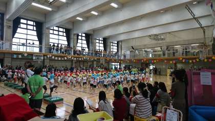 本日、10月15日は塚戸幼稚園の運動会です。あいにくの天気なので、本校の体育館で開催されています。とても、楽しそうですね!多くの保護者・地域の皆様にも応援いただいております。校長先生も園長として大活躍です。