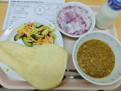 今日は、ナン、牛乳、キーマカレー、じゃがいものハニーサラダ、ヨーグルトのベリーソースがけです。