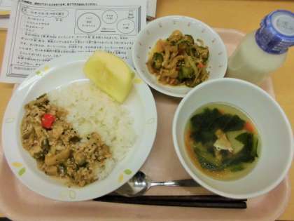 今日は、ガパオライス、牛乳、こんにゃくサラダ、かぶのスープ、りんごです。