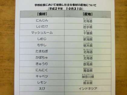 みなさん、今日10月31日は、ハロウィンです。ハロウィンというと日本では、仮装をして楽しむ日というようなイメージを持っている人が多いようですが、本当のハロウィンは、そうではありません。元々は、ある宗教の中で節目の日にあたる日で、秋の食べ物の収穫を祝い、悪霊などを追い払うという行事だったようです。ですから、ハロウィンで悪霊を追い払うために使われる『ジャック・オー・ランタン』も収穫されるカボチャでできています。今日は、そんなハロウィンの献立としてパンプキンパイを取り入れました。みなさんも、食べ物を大切に収穫に感謝していただきましょう。