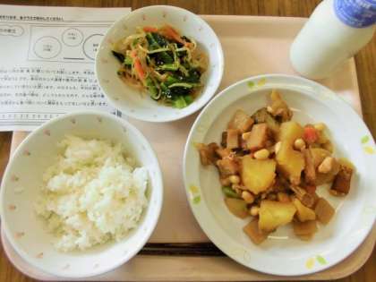 今日は、ごはん、牛乳、豆入り筑前煮、華風あえです。