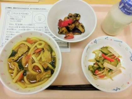 今日は、カレーうどん、牛乳、中華風ごまだれかけ、りんご入り大学芋です。