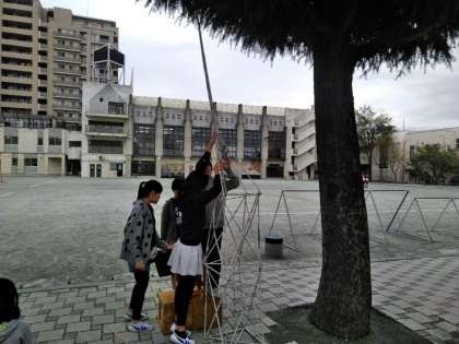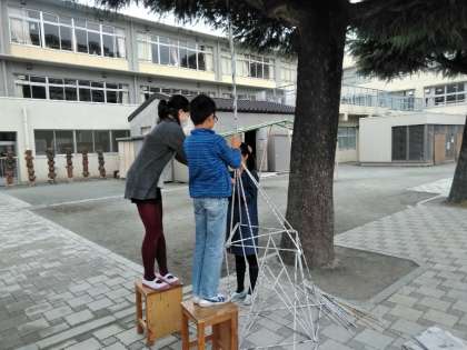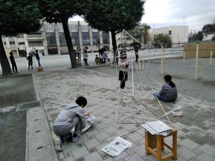 6年生が図工の時間に「新聞タワー」を作っていました。木の棒に新聞紙を巻き付け、それを組み合わせてタワーを作っていく造形遊びです。追求するのは「高さ」と「美しさ」。さすがは6年生。巧みな組み合わせで、見事なタワーが次々とできあがりました。
