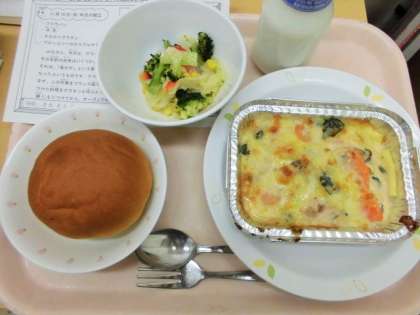 今日は、ぶどうパン、牛乳、マカロニグラタン、ブロッコリーのカラフルサラダです。