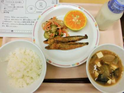 今日は、ごはん、牛乳、ししゃものから揚げ、梅ドレッシングサラダ、なめこのみそ汁、早香です