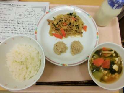 今日は、ごはん、牛乳、珍珠丸子、チャーホーサイ、チンゲンサイとしめじのスープです。
