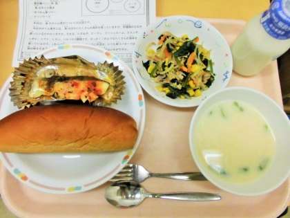 今日は、黒砂糖パン、牛乳、鱈のホイル焼き、ほうれん草ソテー、ビシソワーズです。
