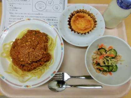今日は、スパゲティーヘルシーミートソース、牛乳、ツナと大根のサラダ、チーズケーキです。