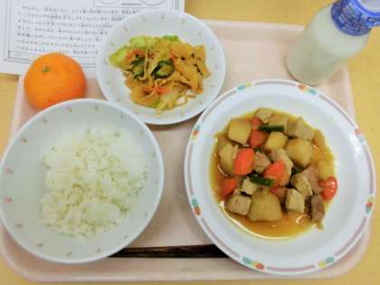 今日は、ごはん、牛乳、肉じゃがうま煮、パリパリサラダ、みかんです。