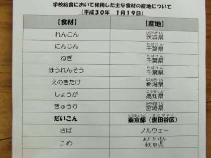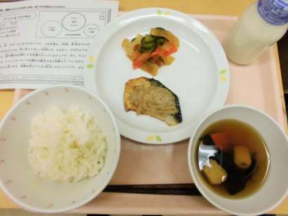 今日は、ごはん、牛乳、魚のごまだれかけ、シャキシャキ野菜、ほうれん草のすまし汁です。