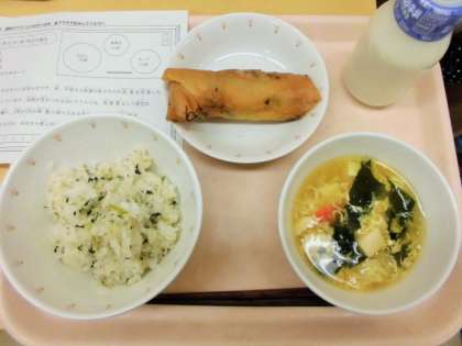 今日は、菜めし、牛乳、春巻き、卵入りわかめスープです。