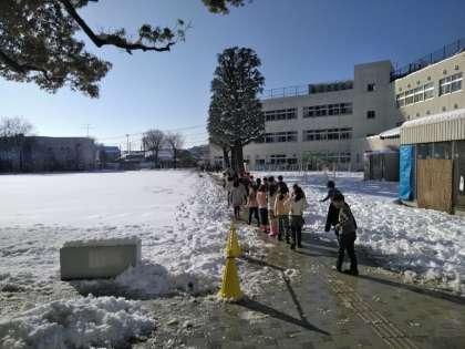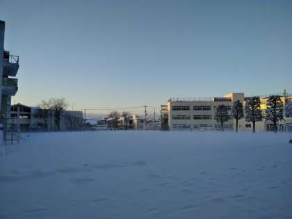 昨日の大雪により、校庭は一面の銀世界となりました。職員は朝早くから雪かきです。