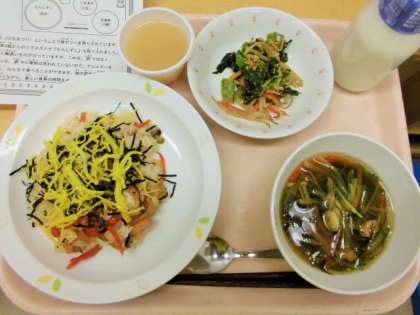 今日は、ちらしずし、牛乳、ごまあえ、沢煮椀、桃ゼリーです。