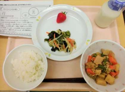 今日は、ごはん、牛乳、じゃがいものそぼろ煮、和風サラダ、いちごです。