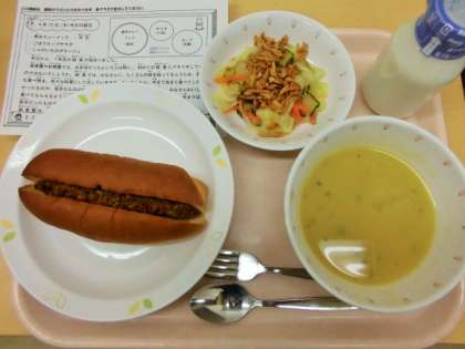 今日は、焼きカレードック、牛乳、ごぼうチップサラダ、じゃがいものポタージュです。